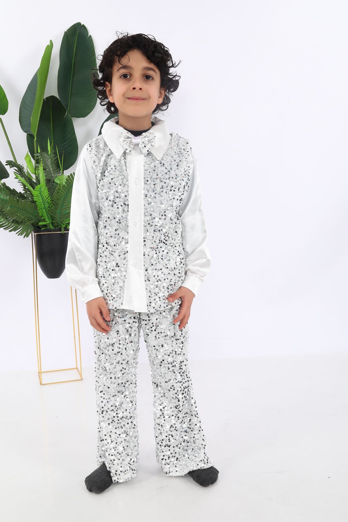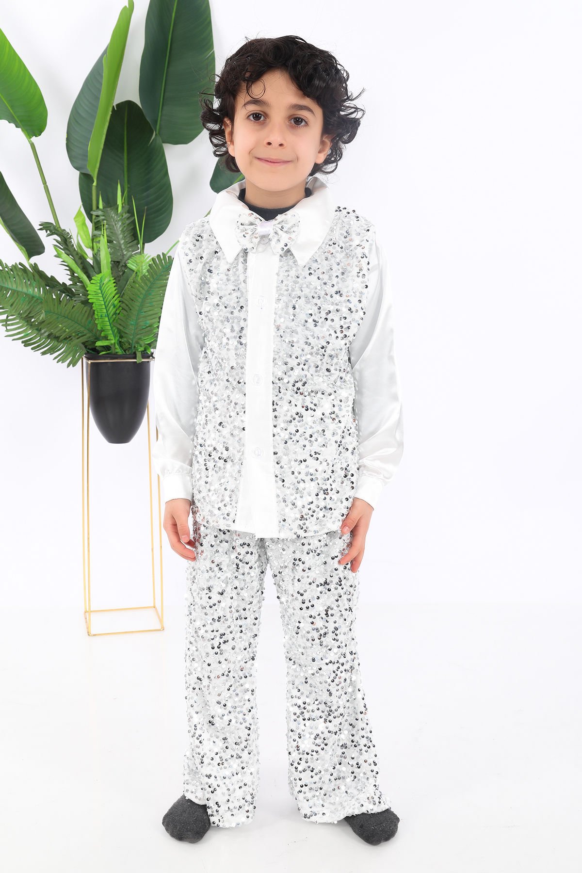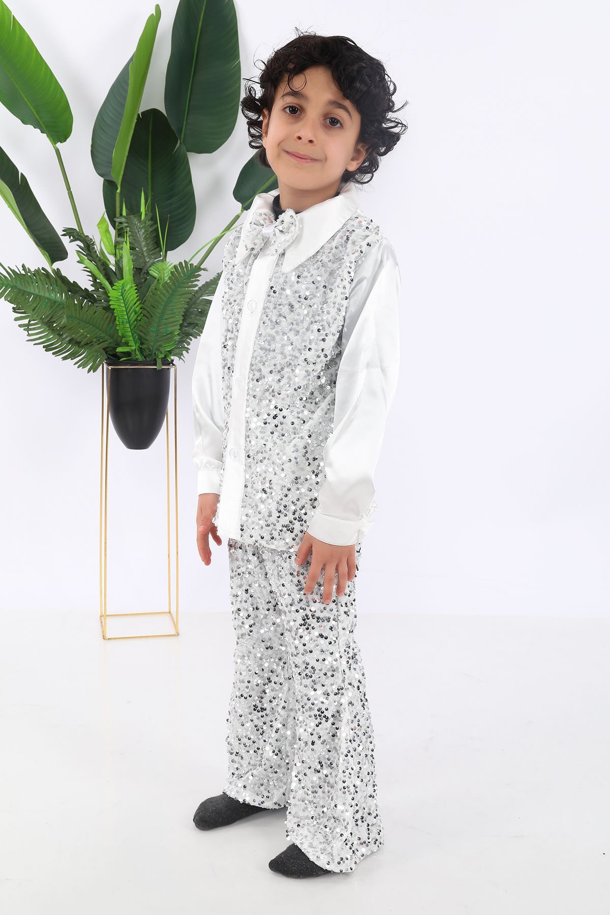 Saten pul payetli kumaşı ile çocukların göz alıcı bir görünüm kazanması sağlanır. Erkek çocuklar için özel olarak tasarlanmıştır, hareket özgürlüğünü kısıtlamaz.Çocuklar için uygun yaş grubuna hitap eder her yaşta rahatça kullanılabilir.Kostüm pantolon, gömlek ve papyondan oluşmaktadır.