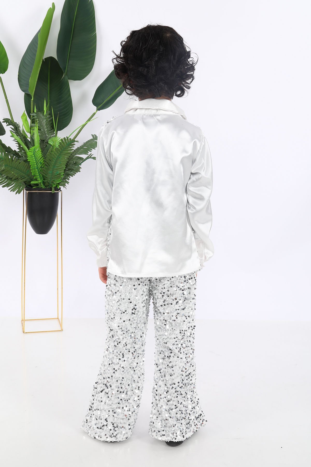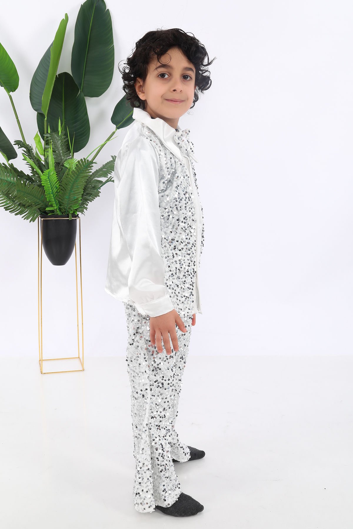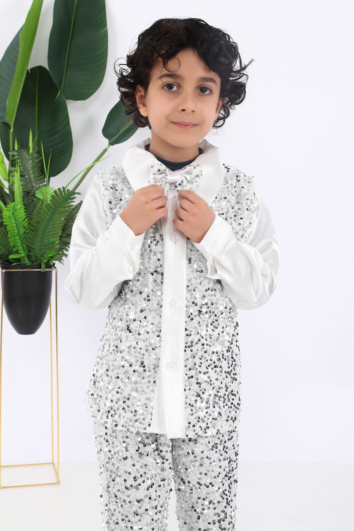 Saten pul payetli kumaşı ile çocukların göz alıcı bir görünüm kazanması sağlanır. Erkek çocuklar için özel olarak tasarlanmıştır, hareket özgürlüğünü kısıtlamaz.Çocuklar için uygun yaş grubuna hitap eder her yaşta rahatça kullanılabilir.Kostüm pantolon, gömlek ve papyondan oluşmaktadır.