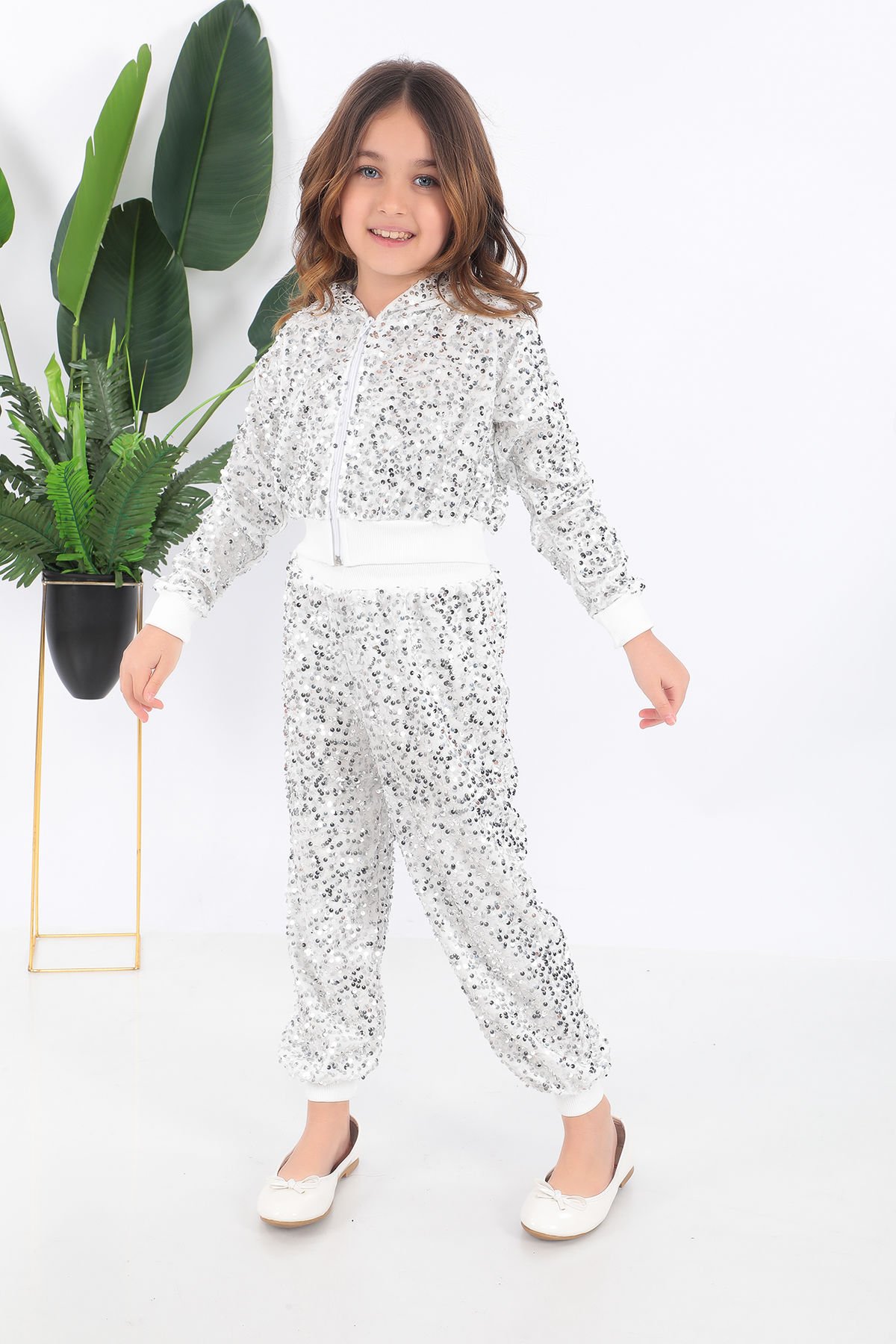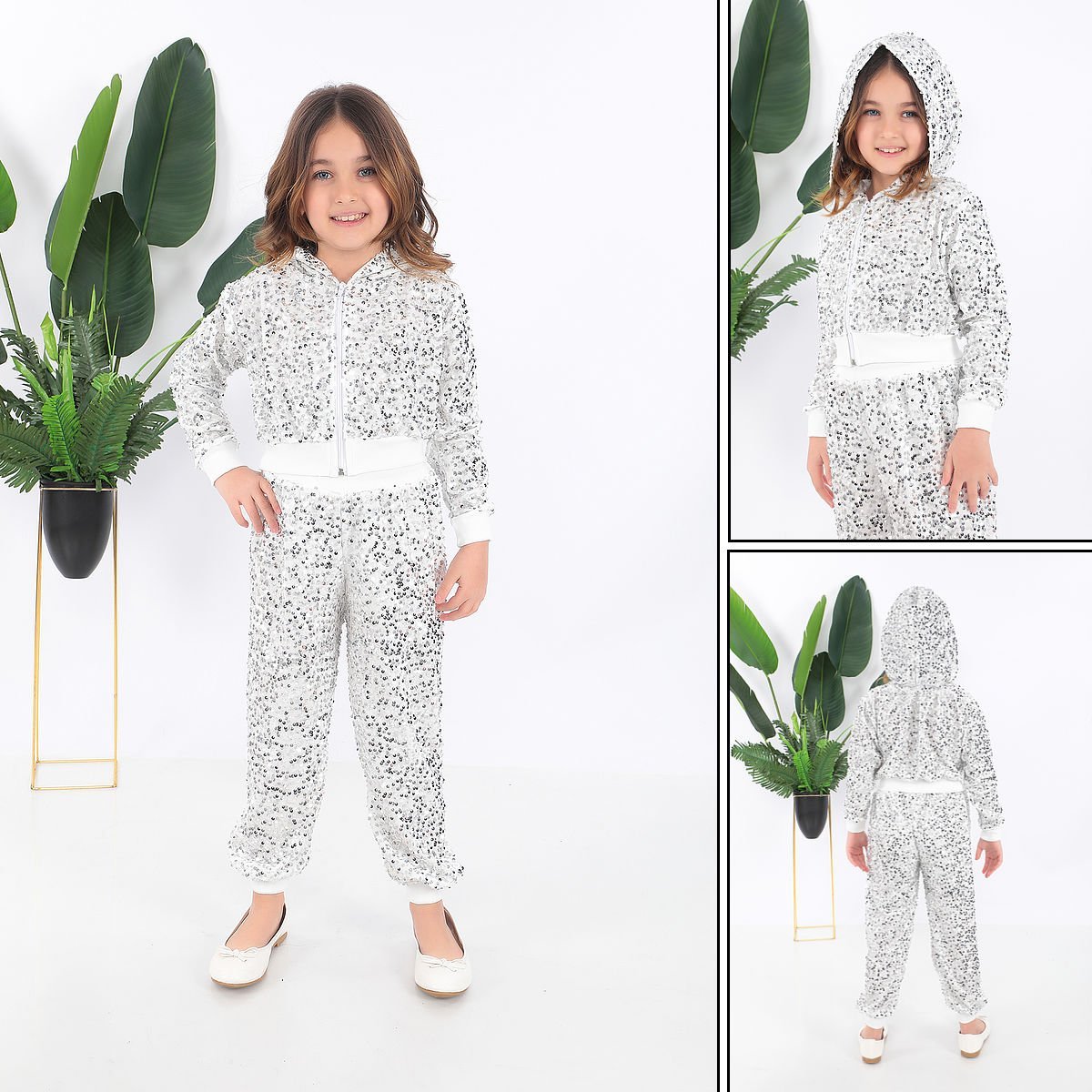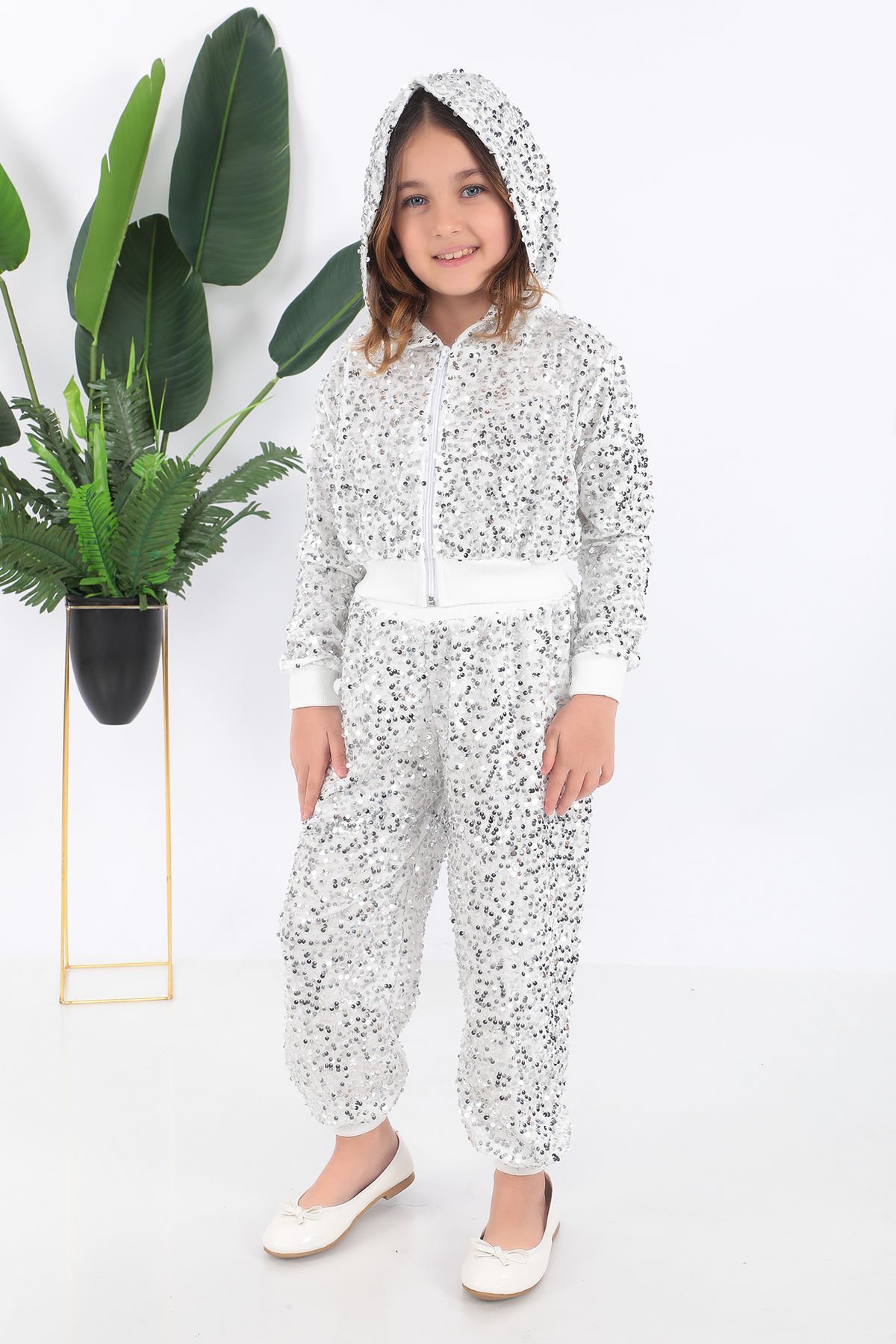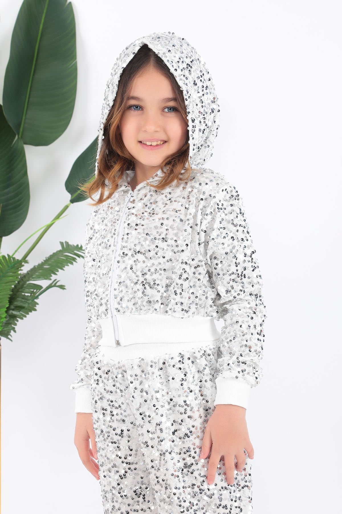 - Parlak pul payet detaylarıyla süslenmiş, çocukların enerjisini yansıtan şık bir tasarım.- Kız çocukları için özel olarak tasarlanmış, rahat hareket etmelerine olanak tanıyan esnek yapıda.- Yaş grubuna uygun olarak belirlenmiş, her çocuğun konforunu ön planda tutan kaliteli malzeme kullanımı.- Yerli üretim olup, Türk işçiliğinin gurur verici bir örneği sunar.- Saten materyali sayesinde yumuşak dokusuyla cildi tahriş etmeden zarif bir görünüm sağlar.Kostüm kapşonlu sweatshirt ve pantolondan oluşmaktadır.