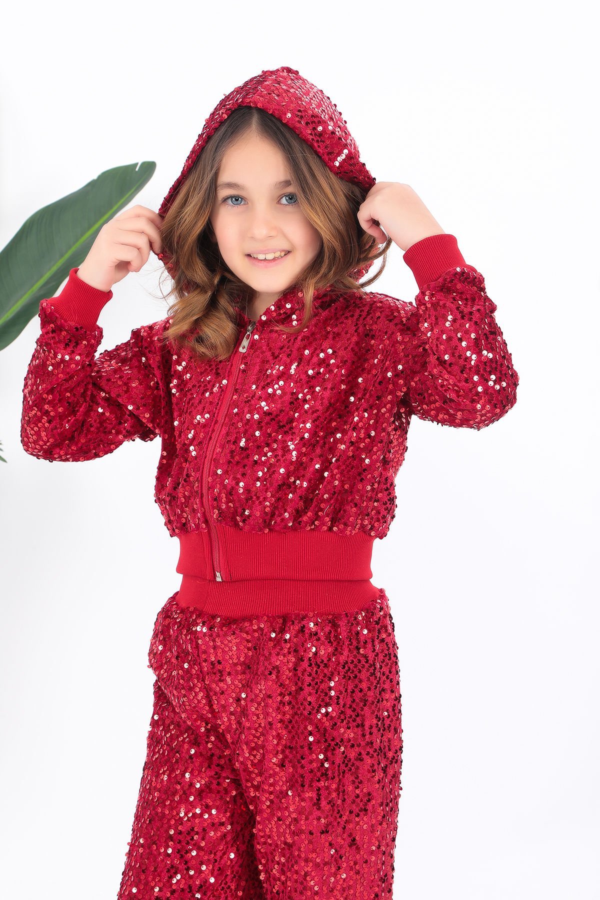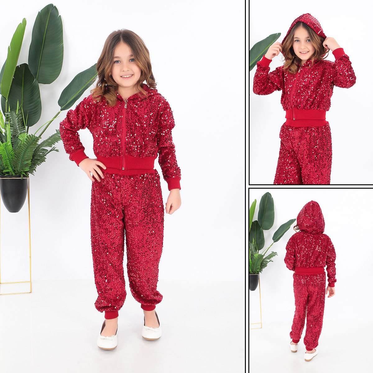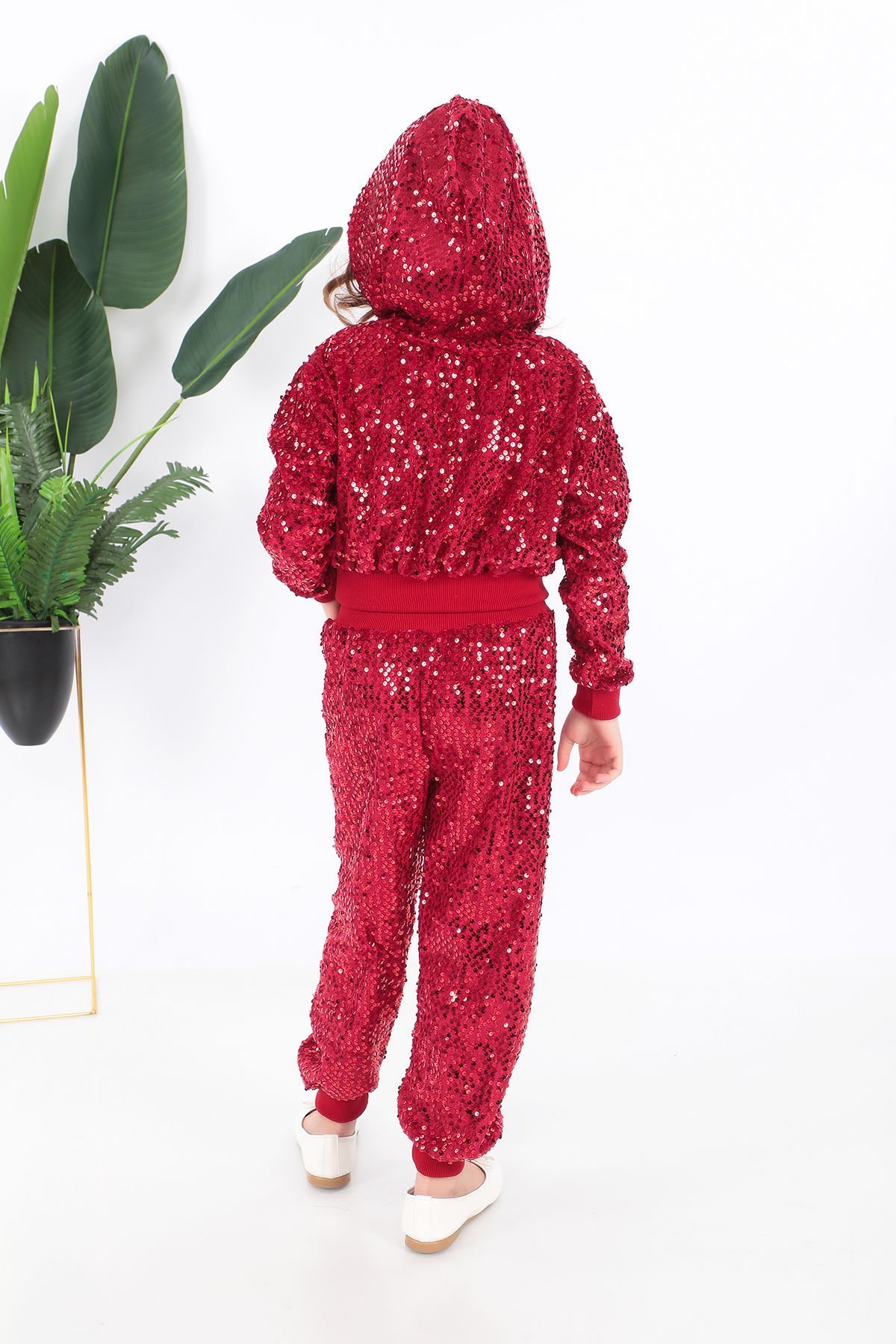 - Kız çocukları için özel olarak tasarlanmış, canlı kırmızı renkli kapşonlu payet detaylarıyla süslenmiş dansçı kostümü.- Çocukların rahat hareket edebilmesi için ideal olan saten materyalden üretilmiştir.- Türkiye'de üretilmiş olup yerel malzemelerle sürdürülebilir moda anlayışını destekler.- Her yaş grubuna uygun olarak tasarlanmıştır; böylece minik dansçılar da büyükler kadar şık görünür.Kostüm kapşonlu sweatshirt ve pantolondan oluşmaktadır.