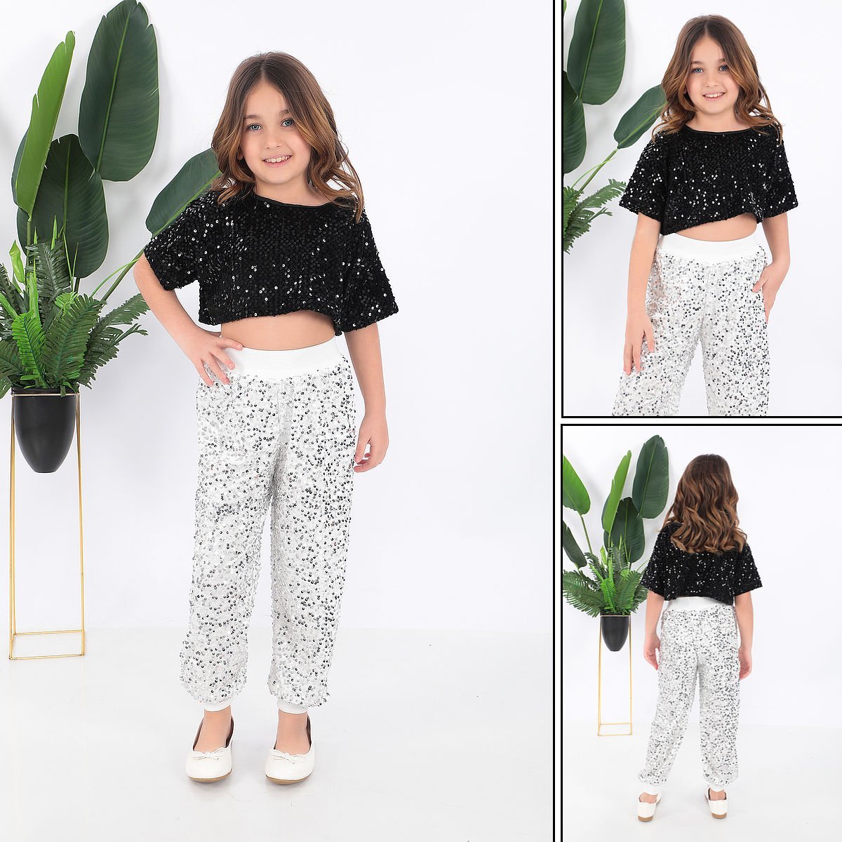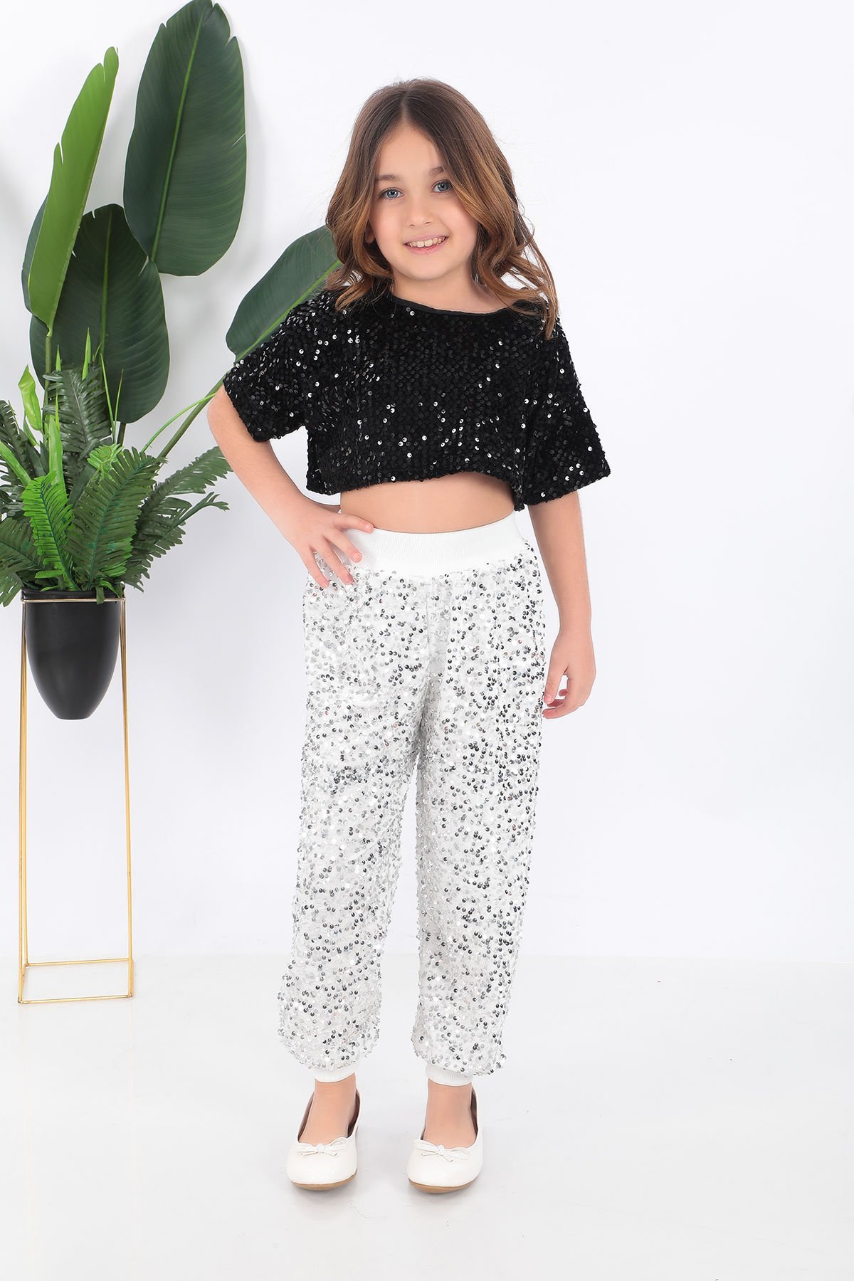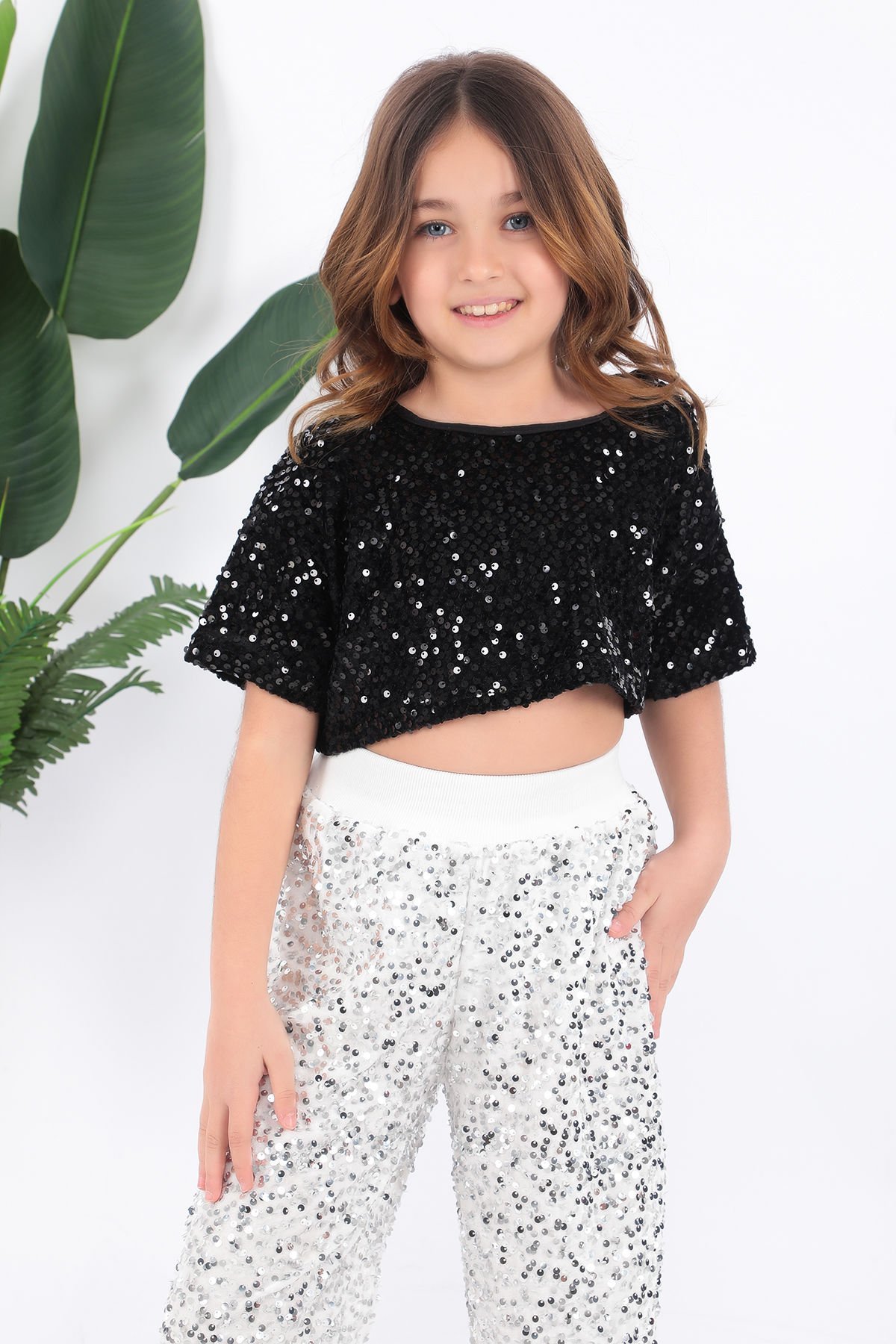 - Parlak pul payet detaylarıyla süslenmiş, çocukların enerjisini yansıtan şık bir tasarım.- Siyah ve beyaz renk kombinasyonu ile hem modern hem de zamansız bir görünüm sunar.- Çocukların rahat hareket edebilmesi için özel olarak tasarlanmış kısa kesim.- Yüksek kaliteli saten kumaşı sayesinde yumuşak dokunuşuyla konfor sağlar.- Türkiye'de üretilmiş olup yerel üretim avantajını aksesuarlarda da hissettirir.Kostüm kısa tişört ve pantolondan oluşmaktadır.