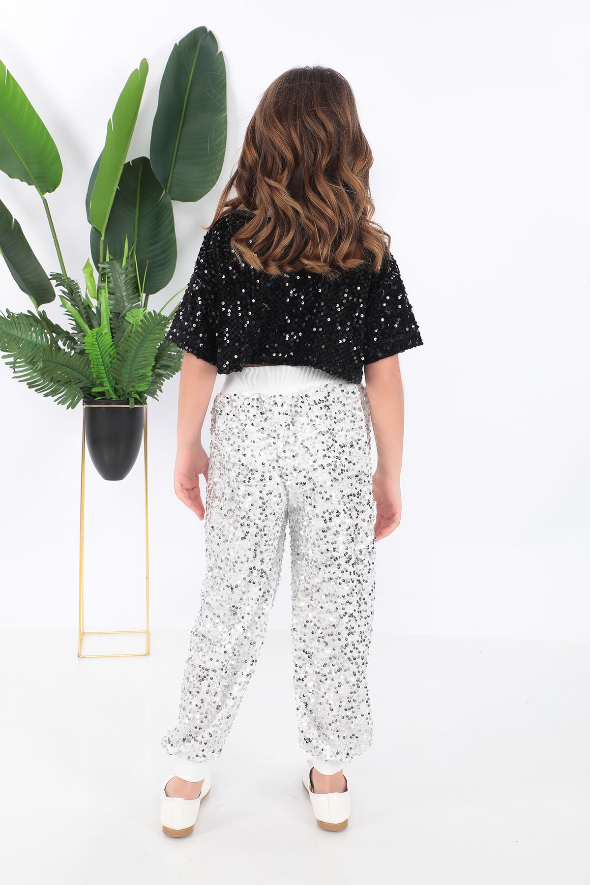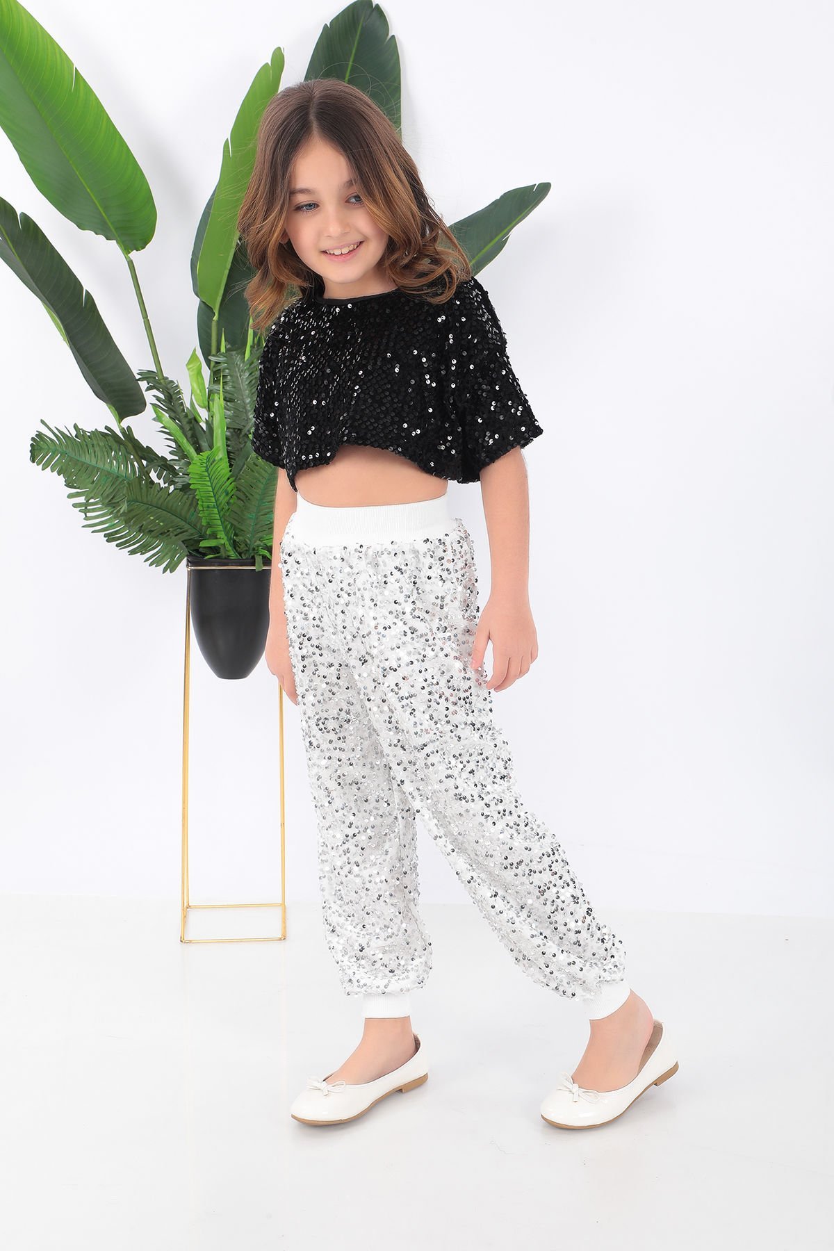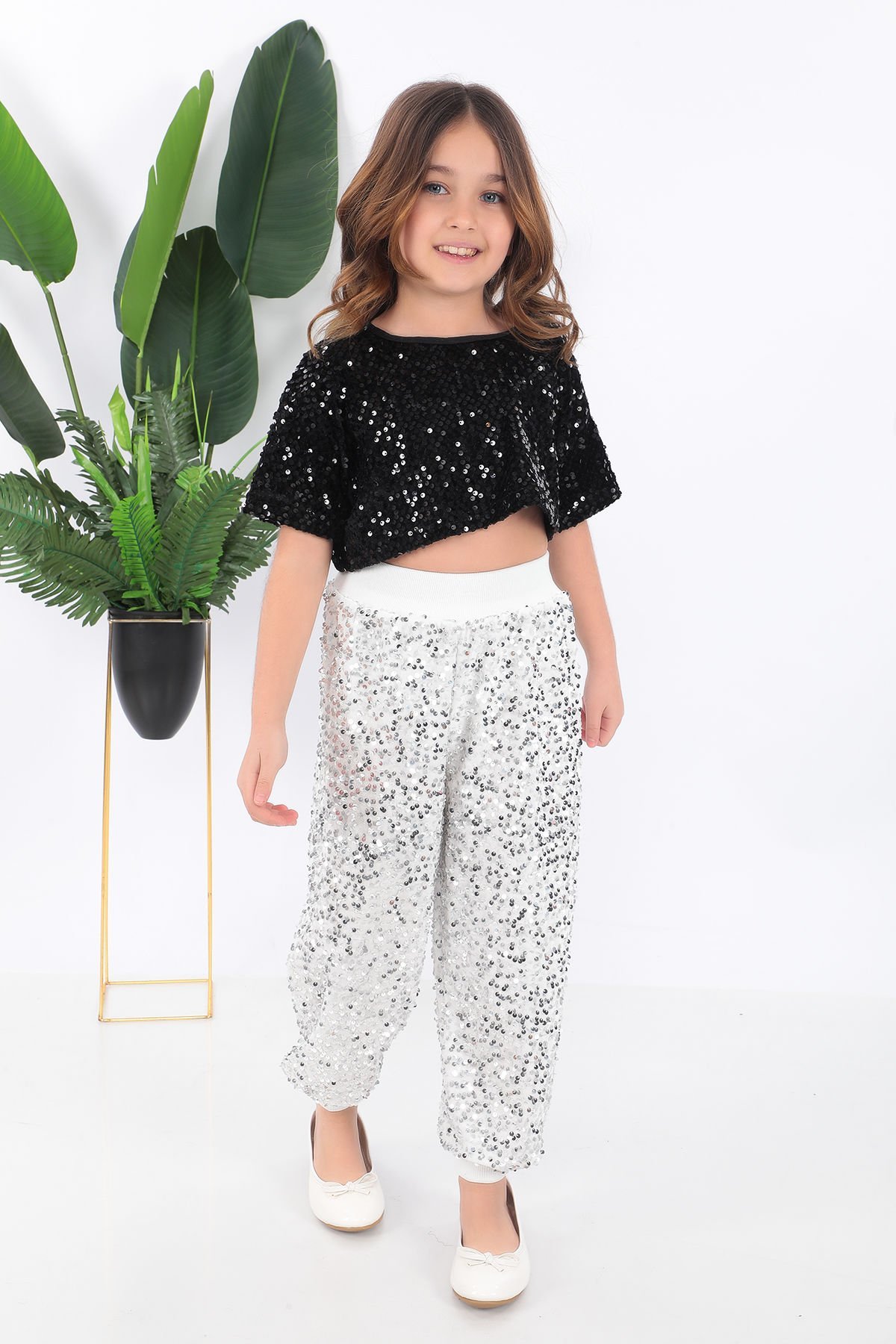 - Parlak pul payet detaylarıyla süslenmiş, çocukların enerjisini yansıtan şık bir tasarım.- Siyah ve beyaz renk kombinasyonu ile hem modern hem de zamansız bir görünüm sunar.- Çocukların rahat hareket edebilmesi için özel olarak tasarlanmış kısa kesim.- Yüksek kaliteli saten kumaşı sayesinde yumuşak dokunuşuyla konfor sağlar.- Türkiye'de üretilmiş olup yerel üretim avantajını aksesuarlarda da hissettirir.Kostüm kısa tişört ve pantolondan oluşmaktadır.